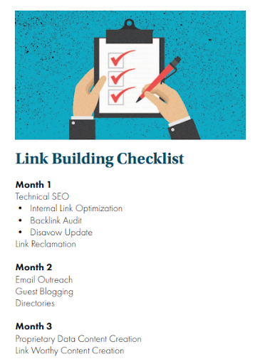 In addition to providing real-world examples of successful link-building tactics and their performance metrics, the eBook concludes by giving readers a 12-month link-building checklist. This is an excellent example of how you can generate leads by offering a concrete path forward in your eBook guide.