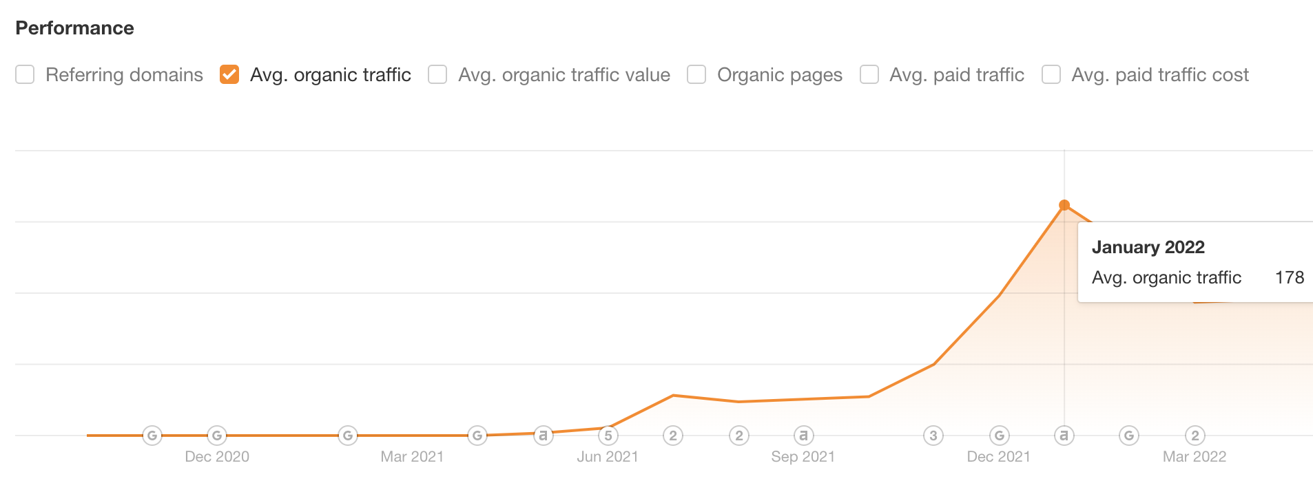At a glance since mid-2021 there has been a significant increase in organic traffic when Stone Claims started multiplying its content marketing efforts with Brafton’s help.