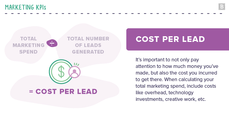 It’s important to not only view things through the lens of how much you’ve made but also the cost to get you there. This is where your Cost Per Lead (CPL — or CAC [Customer Acquisition Cost] if you’re fancy) KPI comes in, which can show you exactly how much you’re spending in order to acquire new customers. You can look at costs like overhead, tech and software investments and the cost of creative efforts to calculate CPL for inbound marketing; or examine costs related to advertising, distribution, sales and marketing efforts and overhead to calculate outbound marketing CPL.