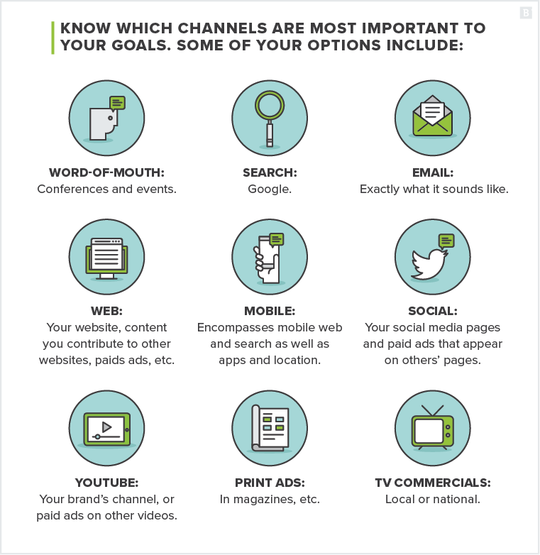 For the purposes of your marketing plan, you need to know which channels are most important to your goals. Some of your options include: