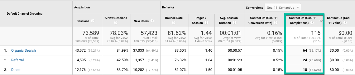 In Brafton’s case, you can see that organic search is generating 55% of all macro conversions, followed by 21% from referral traffic.