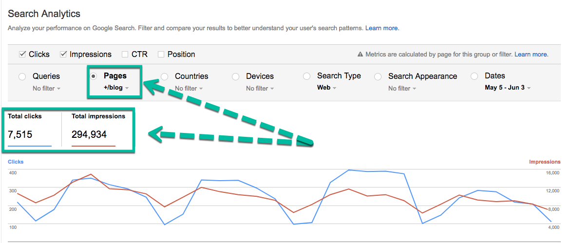 - Clicks: The number of times a page on your site was clicked after it showed up in search results.