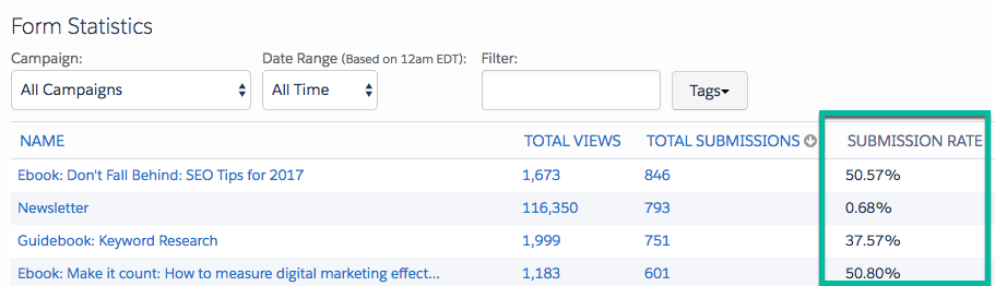 3. Take a look at your funnel visualization. We want to ensure the people who visit your conversion landing page are actually filling in the form. A low conversion rate indicates a low-quality landing page, or issues with your form. Set a benchmark of about 50 percent. We use Pardot to evaluate our asset conversion rates; this tells us the efficacy of our conversion landing pages.