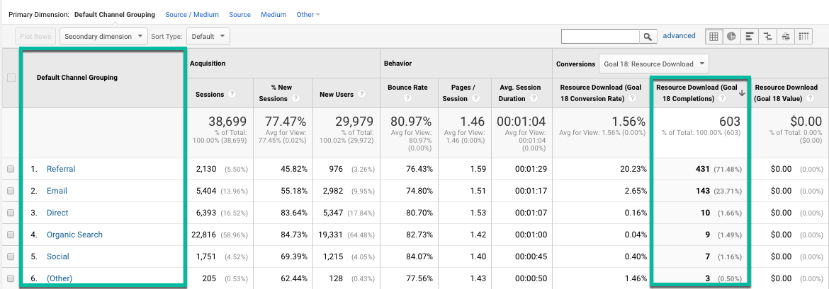 4. Evaluate your top-performing channels. Navigate to Acquisition → All Traffic → Channels. Look to the far right of the screen and hit the goals drop-down and select your eBook goal. What are your top converting channels? What are your bottom converting channels? With this data you will know where you need to shore up your strategy.