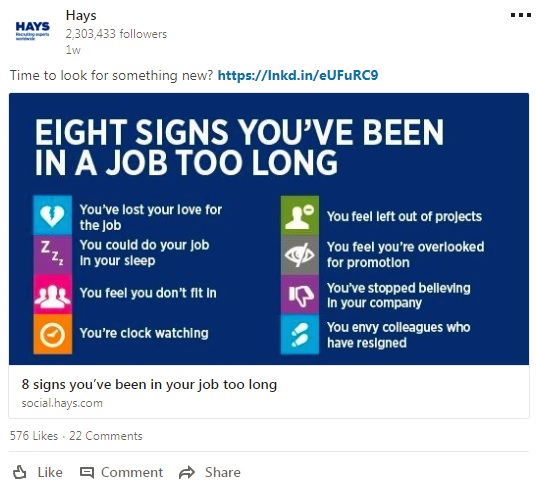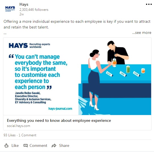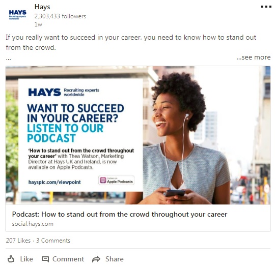 So who is the exemplar of LinkedIn profiles? According to LinkedIn itself, it’s Hays, a recruiting firm that topped the list of “Best Company Pages in 2017.”