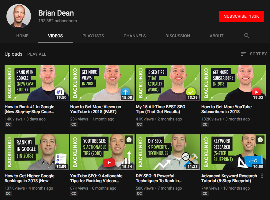 That’s what Brian Dean of Backlinko does with his YouTube channel.