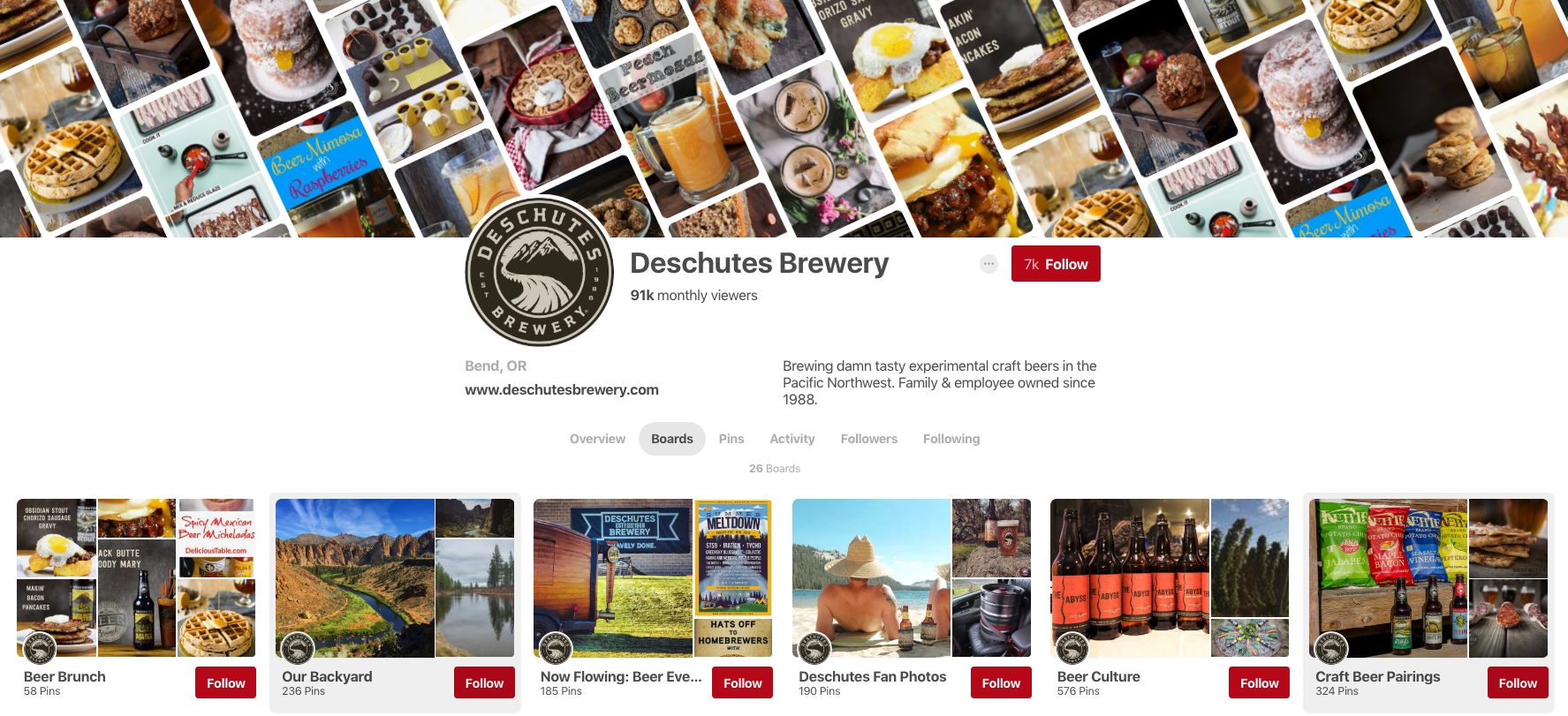 While Deschutes certainly pins visuals of its own products, it also has distinct boards for “Deschutes Fan Photos,” “Women & Craft Beer” and “Our Backyard.”
