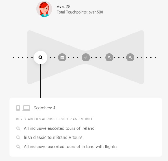 Customers, instead, navigate all over the web, across more than one device and at various times before finalizing their purchases. There are often more than 500 touchpoints before a customer actually becomes a paying customer. In the example above, “Ava” wanted to book a flight to Ireland, and she queried Google four different times to begin her journey. It took hundreds of more engagements (clicks, comparisons, etc.) before Ava completed a purchase.