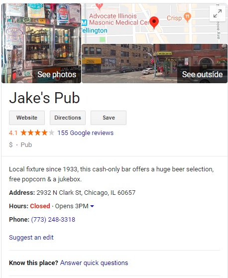 As a searcher, I don’t even need to click anything – not even once. I have here, through this Knowledge Panel, everything I need to make a decision on whether to go to Jake’s. The answer is, yes, I did. I do. I love that place.