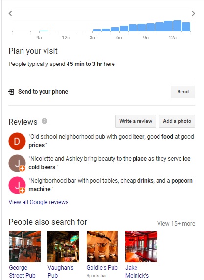 Just one more scroll down the page and you see even more super-relevant information about Jake’s Pub, such as when it tends to be most crowded, customer testimonials and similar establishments you may want to head to afterward: