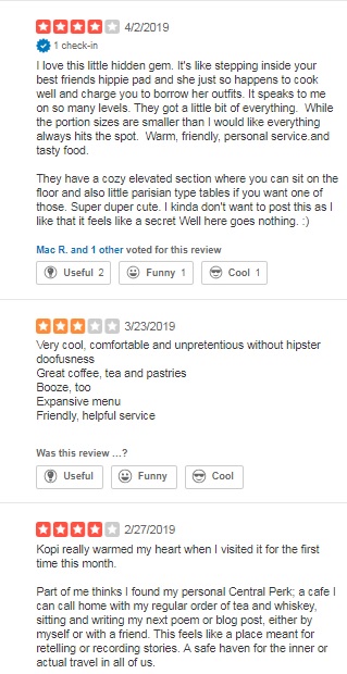 Here’s how my favorite Chicago cafe, Kopi Travelers Cafe, fares on Yelp: