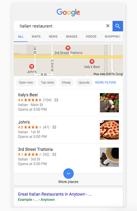 On a mobile screen, specifically, a query for “Italian restaurant” will return this 3-pack of options above traditional business listings. It’s essentially the only thing searchers will see, so you have to ensure your company is optimized to be featured here.