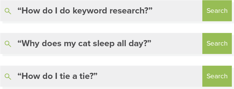 People use these types of keywords when they are trying to learn something, and as such, they expect to find blog content or other in-depth resources that will do a great job of answering their questions. These types of keyword phrase searches look like:
