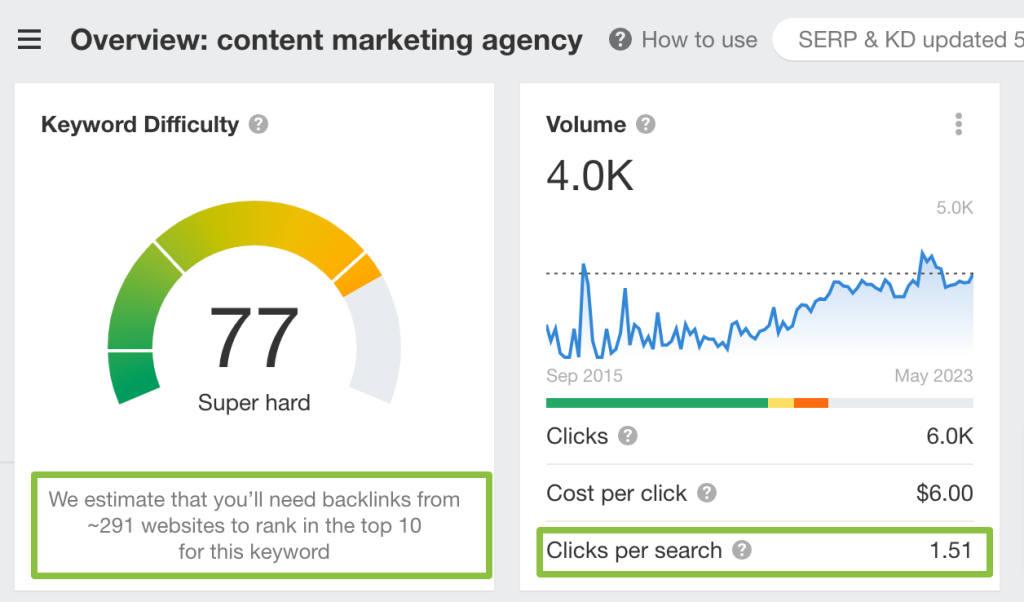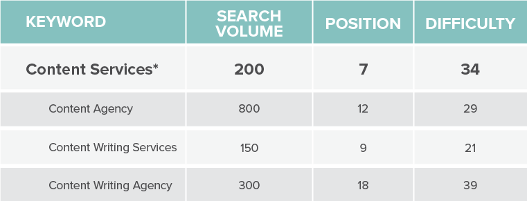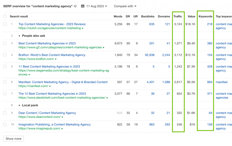 Look at that: We’re not even targeting “Content agency,” yet it ranks in position 12 and has more promising metrics than a lot of our other keywords. This seems like a better target, but I still need more information before I make a decision on what main keyword to target.