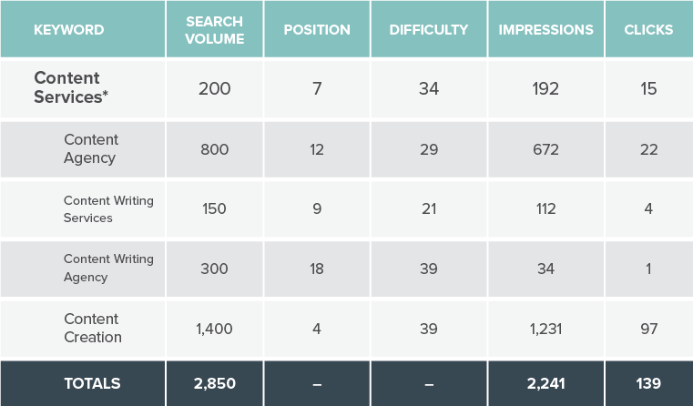 This adds an interesting wrinkle: “Content Creation” didn’t show up on our SEO tools’ radars, yet there it is, driving a respectable number of clicks. Furthermore, I ran the keyword through my paid tool and learned that it has the highest search volume out of all the available options.