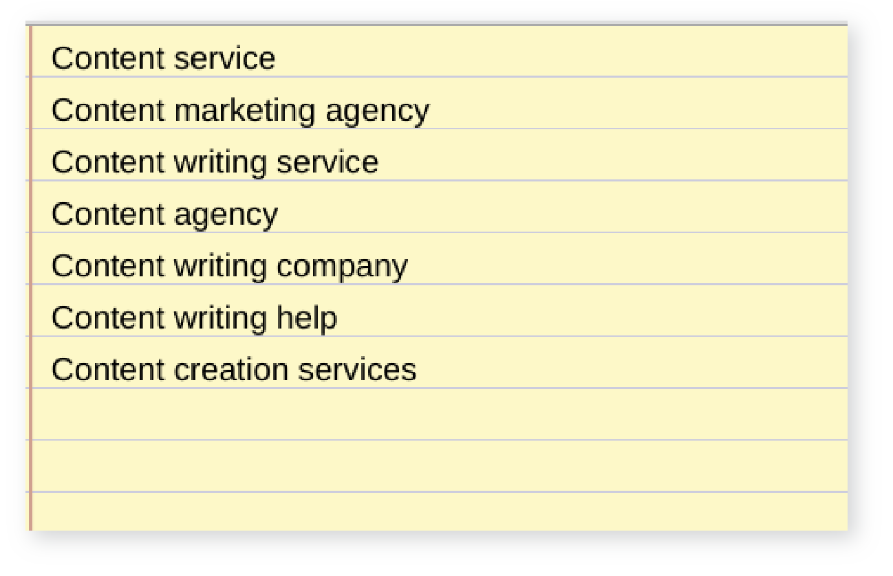Begin with an idea, called a “seed keyword” from which every other idea will branch out. This is the core idea, or an umbrella phrase that broadly covers the topic at large. Once you have this word written down, jot down every similar keyword you can think of related to that topic. Don’t be shy; record everything that pops into your mind whether you think it’s relevant or not. As you look through these words, you can have a better picture of how you personally use language to describe your company or the services that you offer.