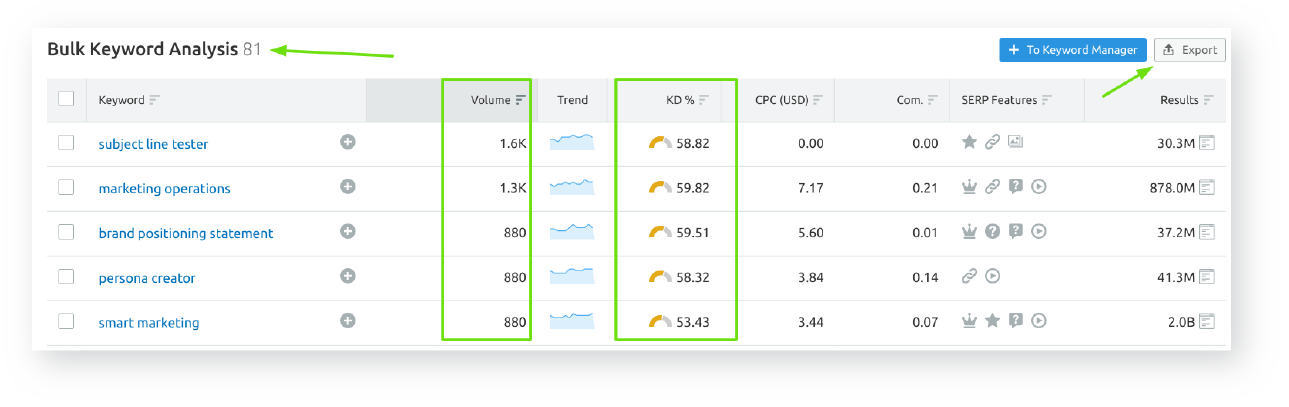 We are looking for keywords with the best combination of high search volume, low difficulty and (optional) strong SERP data. I usually start this process by eliminating keywords that I’m positive I won’t be targeting. You can use your inductive reasoning skills for this, on top of the previous research into what keywords have been the most common or appear the most helpful in potential results.