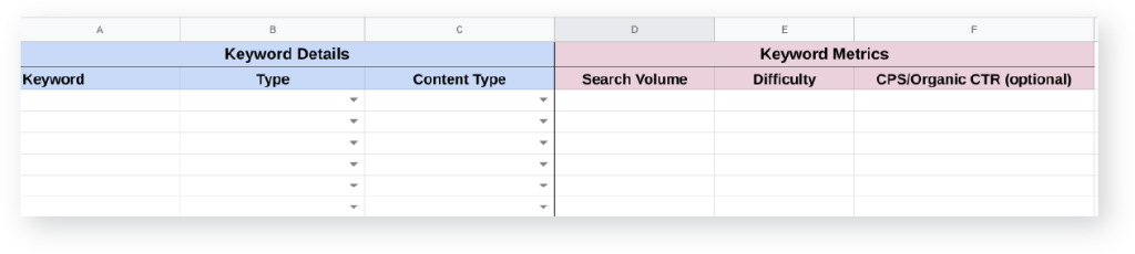 Are these even good keywords? You won’t know until you run them through a tool and grab some metrics. Sometimes, the words you believe are being used in a search engine by your target audience aren’t actually the phrases they are looking up. Bulk upload each of your keyword targets into your paid tool of choice and populate the data in your spreadsheet.