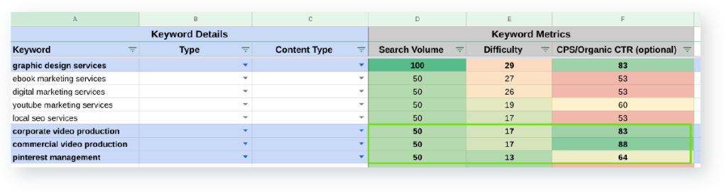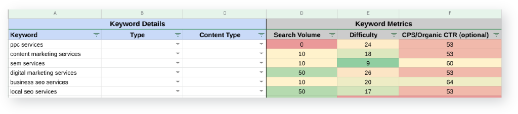 Use conditional formatting for each of the search volume, difficulty and CPS/Organic CTR columns. You’ll want higher search volume and CPS/Organic CTR metrics to appear green, and lower numbers to appear red. Do the opposite process that you used to find keyword difficulty, with lower numbers being green and higher numbers being red.
