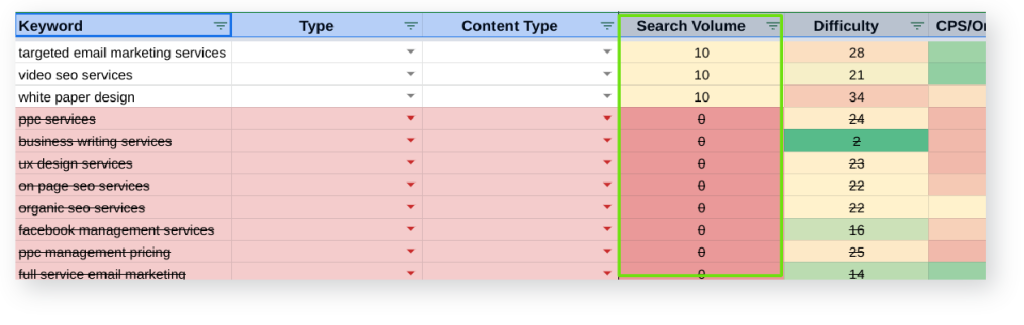 I’ll immediately disqualify keywords with zero search volume by marking the cells red. I’d recommend not deleting the keywords because if you revisit this list in the future you’ll want to know the keywords you’ve already eliminated. You’ve already done the research into what the right keywords are, and found which keywords don’t work — this can save you tons of time if or when you need to complete this process again in the future.