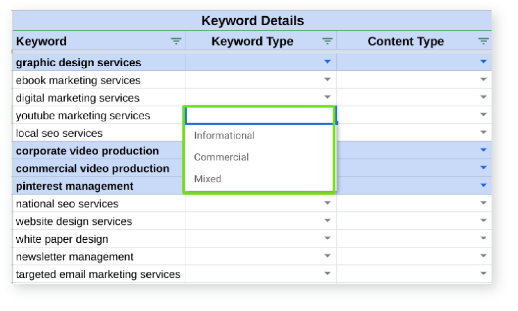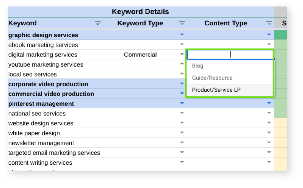 Go through your top keywords and choose the type of content you will want to create for each keyword.