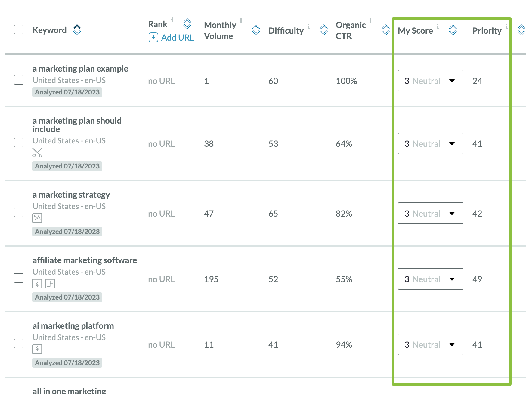 Now that you have a more manageable list, you can start scanning for keywords that have strong metrics and a high level of relevance to your brand. As I go along, I’ll generally highlight my favorite keywords light blue.