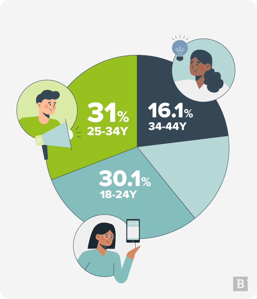 Breaking these users down based on age, the largest group is between 25 and 34 (31%), followed closely by 18-24-year-olds (30.1%) and 34-44-year-olds (16.1%).